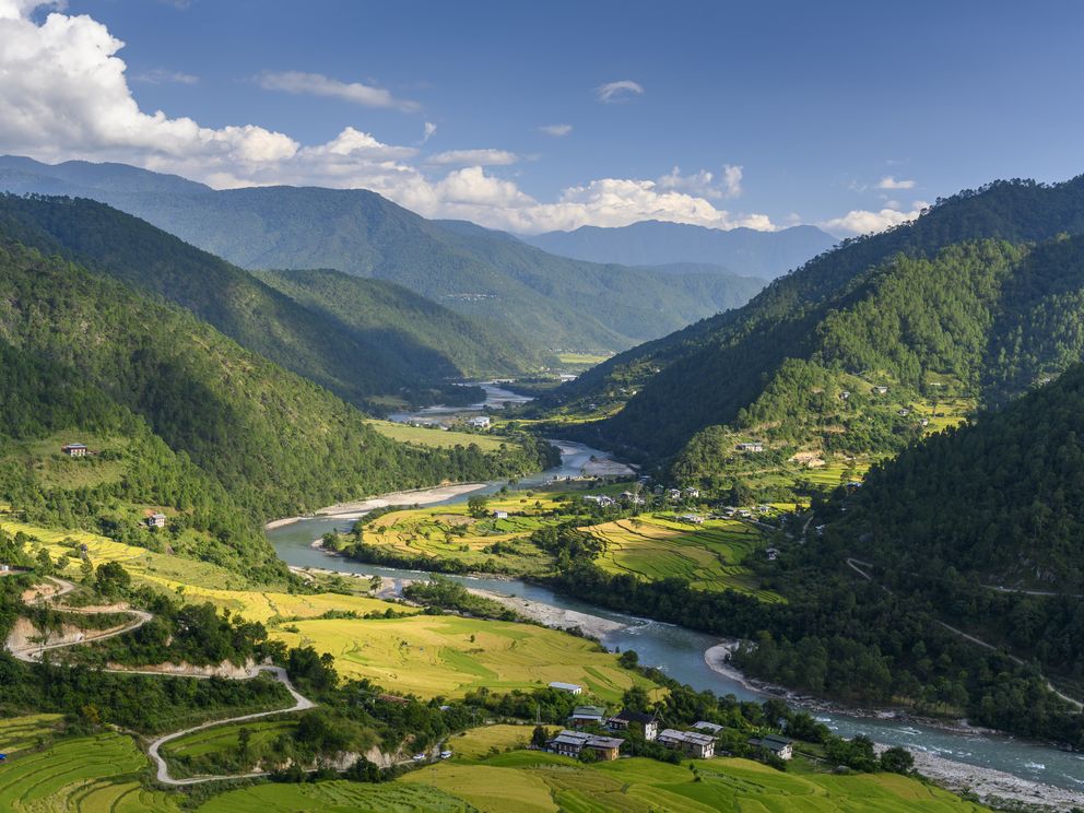 Im Herzen Bhutans verbirgt sich eines der faszinierendsten Täler des Landes: das Punakha-Tal. Auf rund 1300 Metern Höhe breitet sich eine üppige, grüne Landschaft aus – sanft geschwungene Hügel, leuchtende Reisfelder und die klaren Wasserläufe von Mochu und Pochu prägen das Bild. Über allem thront der prächtige Punakha-Dzong, ein Klosterkomplex aus dem 17. Jahrhundert, der zu den schönsten und am besten erhaltenen Bauwerken Bhutans zählt.