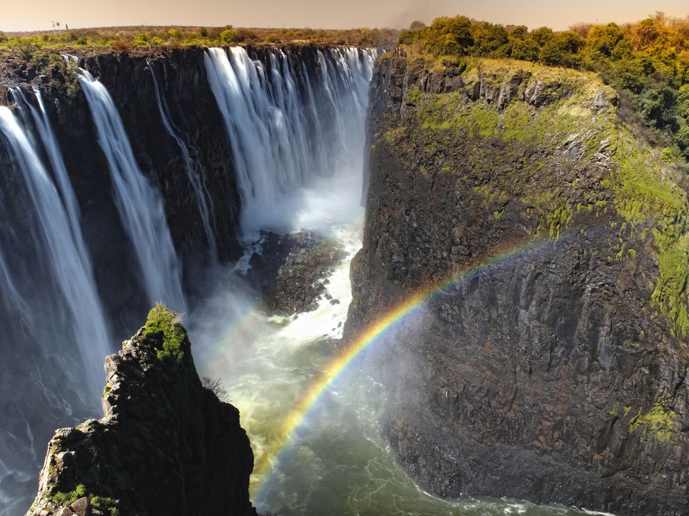 An der Grenze zwischen Sambia und Simbabwe stürzt der Sambesi mit überwältigender Kraft in die Tiefe – über 100 Meter hoch und fast 1,7 Kilometer breit. Die Victoriafälle zählen zu den beeindruckendsten Naturwundern unseres Planeten und bieten ein Spektakel, das unvergessen bleibt. Der feine Sprühnebel steigt hunderte Meter auf und ist noch aus weiter Entfernung sichtbar, während das Donnern der Wassermassen bis zu 40 Kilometer durch die Landschaft rollt. Nicht ohne Grund nennen die Einheimischen dieses Naturphänomen „Mosi-oa-Tunya“ – den donnernden Rauch. Wer die Fälle in ihrer ganzen Pracht erleben möchte, reist am besten zum Ende der Regenzeit, wenn sie besonders mächtig sind. Ob aus der Perspektive eines Helikopterflugs oder von den zahlreichen Aussichtspunkten aus – die Victoriafälle zeigen Naturgewalt in ihrer eindrucksvollsten Form.